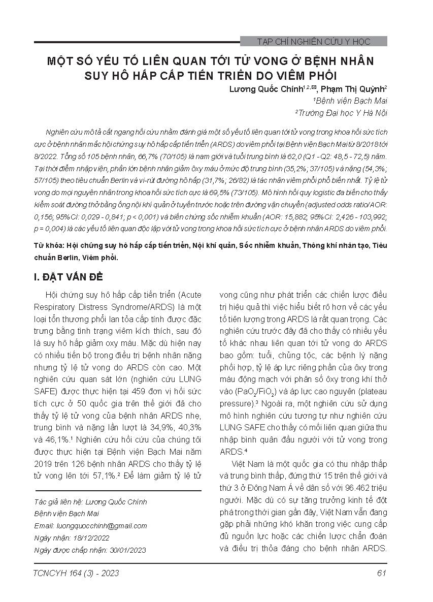 Một số yếu tố liên quan tới tử vong ở bệnh nhân suy hô hấp cấp tiến triển do viêm phổi
