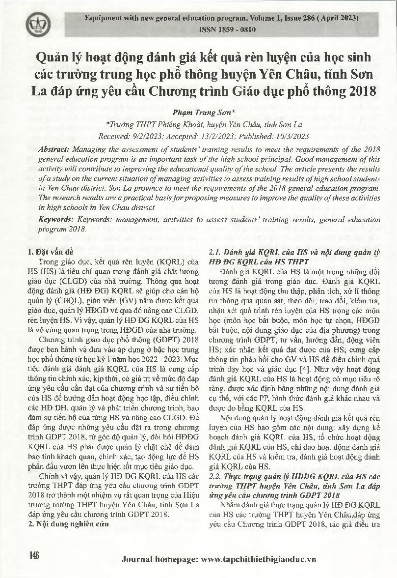 Quản lý hoạt động đánh giá kết quả rèn luyện của học sinh các trường trung học phổ thông huyện Yên Châu, tỉnh Sơn La đáp ứng yêu cầu Chương trình Giáo dục phổ thông 2018 = Managing activities to assess training results of high school students in Yen Chau