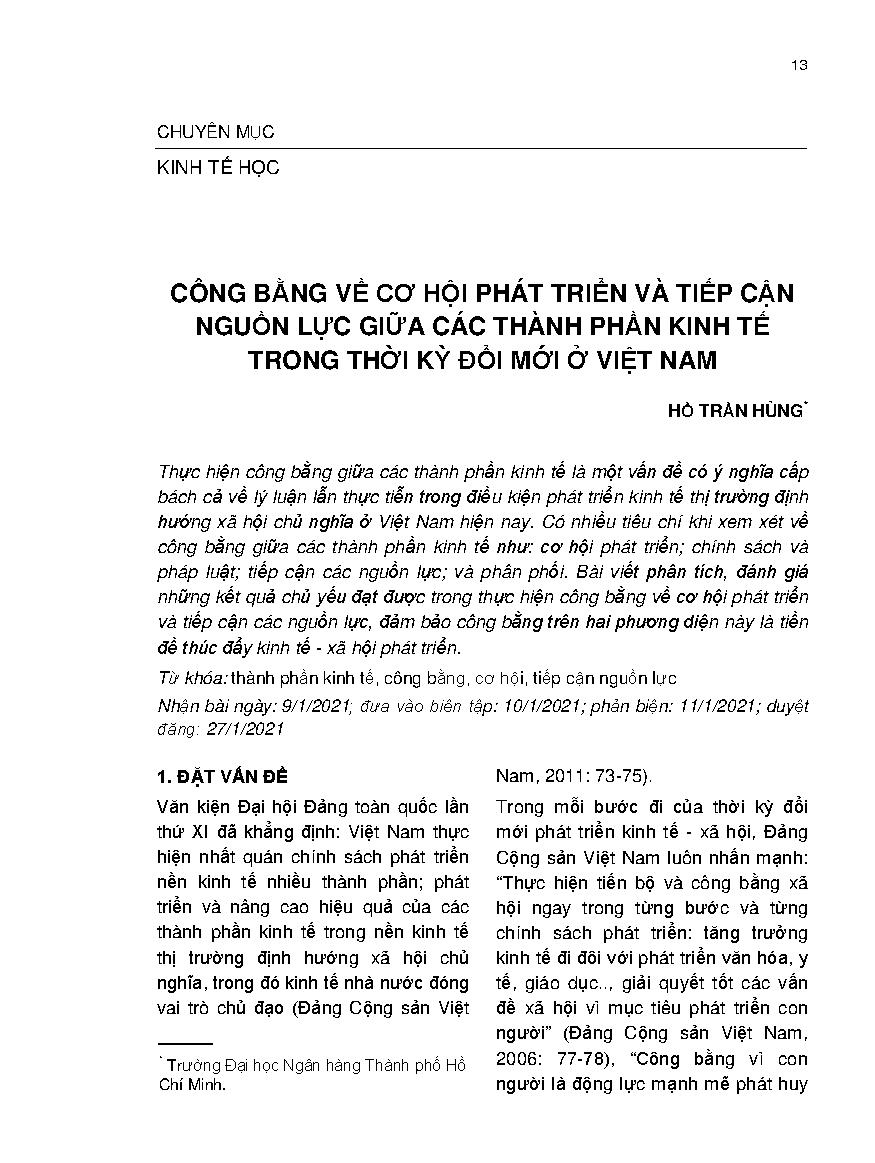 Công bằng về cơ hội phát triển và tiếp cận nguồn lực giữa các thành phần kinh tế trong thời kỳ đổi mới ở Việt Nam = Equity of opportunity for development and resource access amongst economic sectors in the renovation period of Vietnam