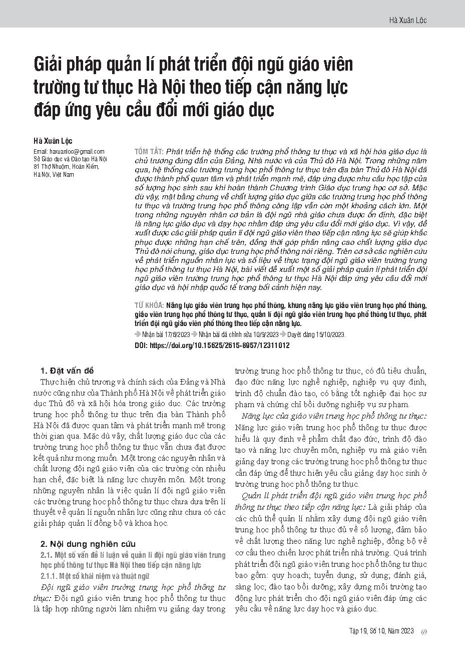 Giải pháp quản lí phát triển đội ngũ giáo viên trường tư thục Hà Nội theo tiếp cận năng lực đáp ứng yêu cầu đổi mới giáo dục = Solutions for managing and developing the teaching staff in hanoi private schools toward the competency approach to meet the req