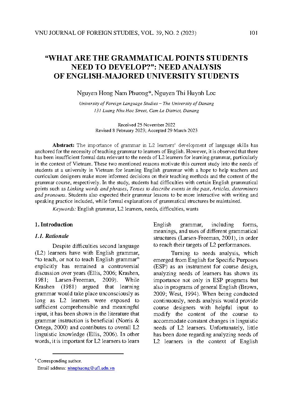 Sinh viên cần cải thiện những điểm ngữ pháp nào?: phân tích nhu cầu của sinh viên chuyên ngành ngôn ngữ Anh = What are the grammatical points students need to develop?: need analysis of English-majored university students