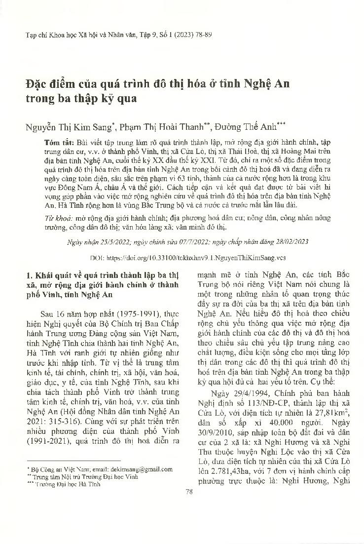 Đặc điểm của quá trình đô thị hóa ở tỉnh Nghệ An trong ba thập kỷ qua = Features of the urbanization process in Nghe An province in the past three decades