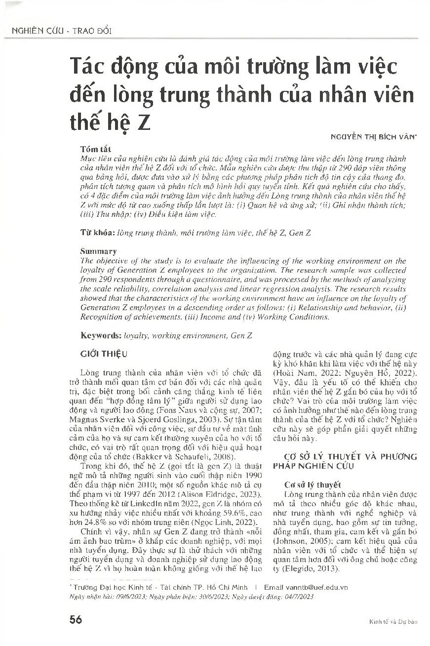 Tác động của môi trường làm việc đến lòng trung thành của nhân viên thế hệ Z