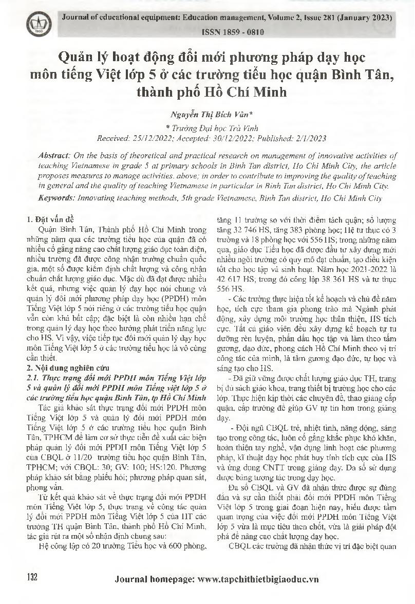 Quản lý hoạt động đổi mới phương pháp dạy học môn tiếng Việt lớp 5 ở các trường tiểu học quận Bình Tân, thành phố Hồ Chí Minh = Managing the innovation of teaching methods of 5th grade Vietnamese at primary school in Binh Tan District, Ho Chi Minh City