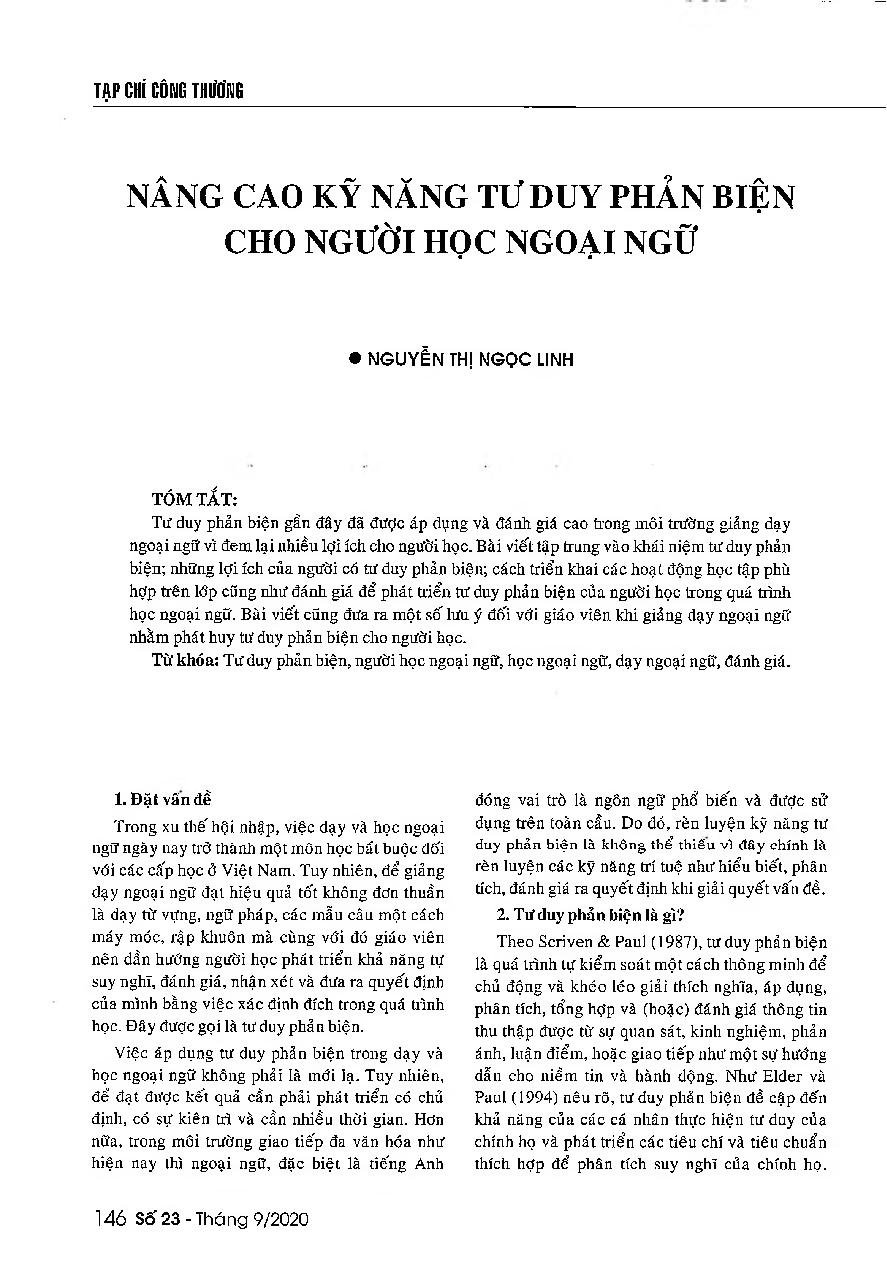 Nâng cao kỹ năng tư duy phản biện cho người học ngoại ngữ = Promoting the critical thinking of foreign language learners