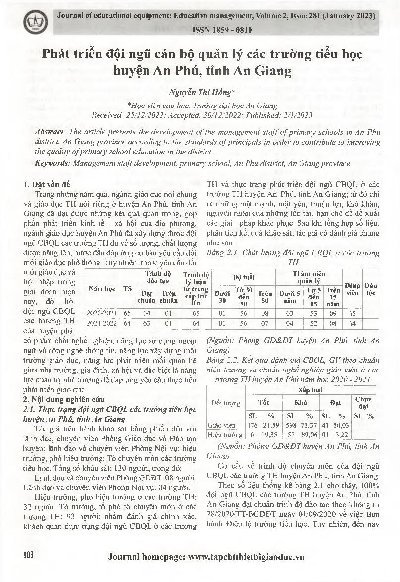 Phát triển đội ngũ cán bộ quản lý các trường tiểu học huyện An Phú, tỉnh An Giang = Developing the management staff of primary schools in An Phu district, An Giang province