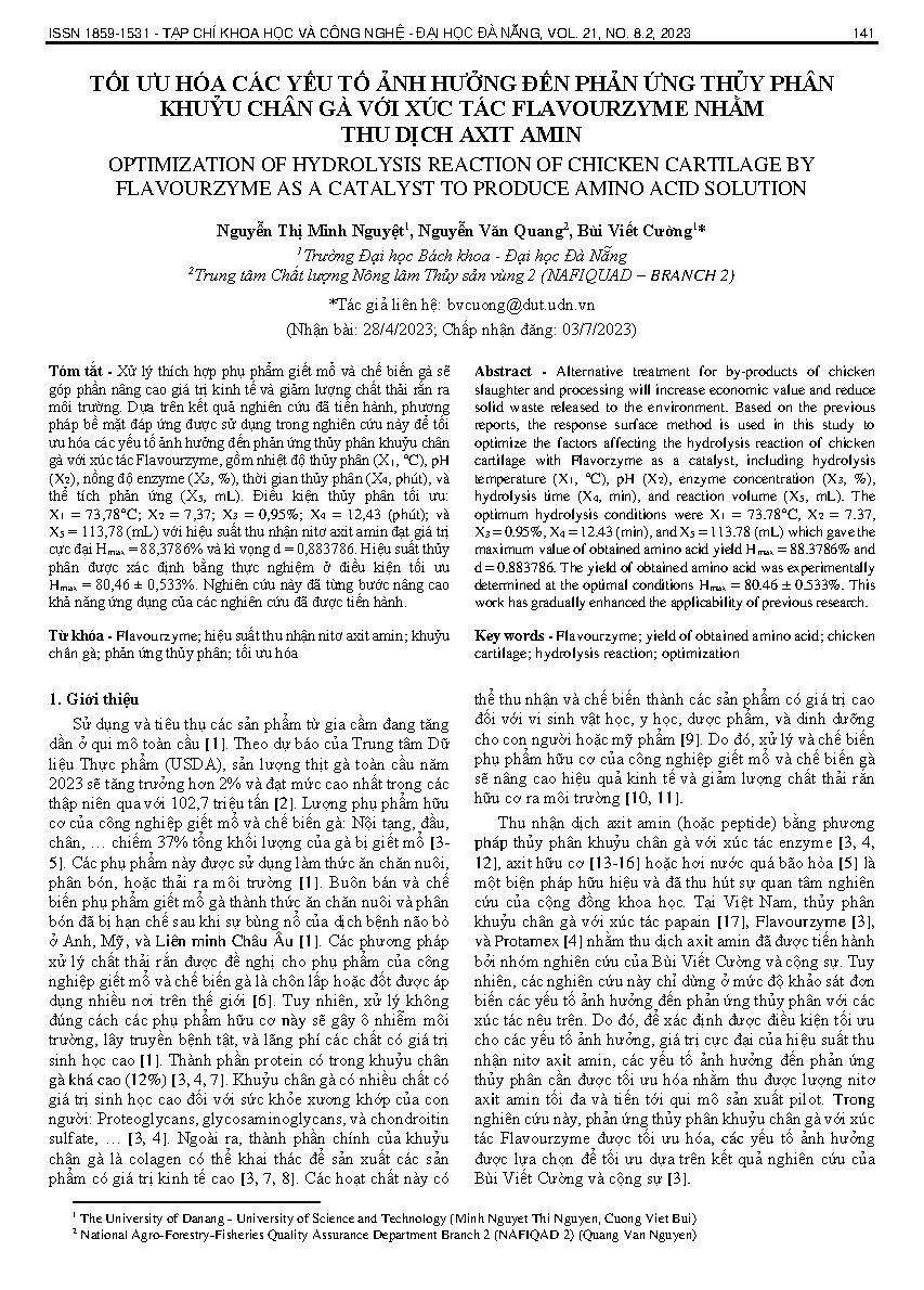 Tối ưu hóa các yếu tố ảnh hưởng đến phản ứng thủy phân khuỷu chân gà với xúc tác flavourzyme nhằm thu dịch axit amin = Optimization of hydrolysis reaction of chicken cartilage by flavourzyme as a catalyst to produce amino acid solution