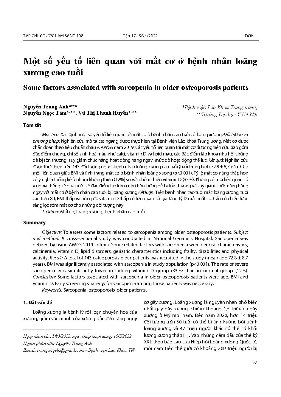 Một số yếu tố liên quan với mất cơ ở bệnh nhân loãng xương cao tuổi = Some factors associated with sarcopenia in older osteoporosis patients