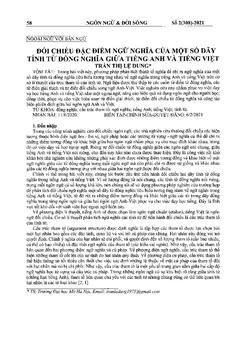 Đối chiếu đặc điểm ngữ nghĩa của một số dãy tính từ đồng nghĩa giữa tiếng anh và tiếng Việt