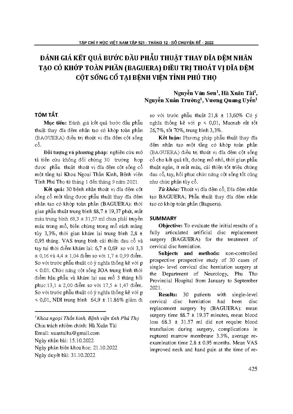 Đánh giá kết quả bước đầu phẫu thuật thay đĩa đệm nhân tạo có khớp toàn phần (Baguera) điều trị thoát vị đĩa đệm cột sống cổ tại Bệnh viện tỉnh Phú Thọ = Evaluation of initial results of artificial disc replacement surgery with total joints (Baguera) to t