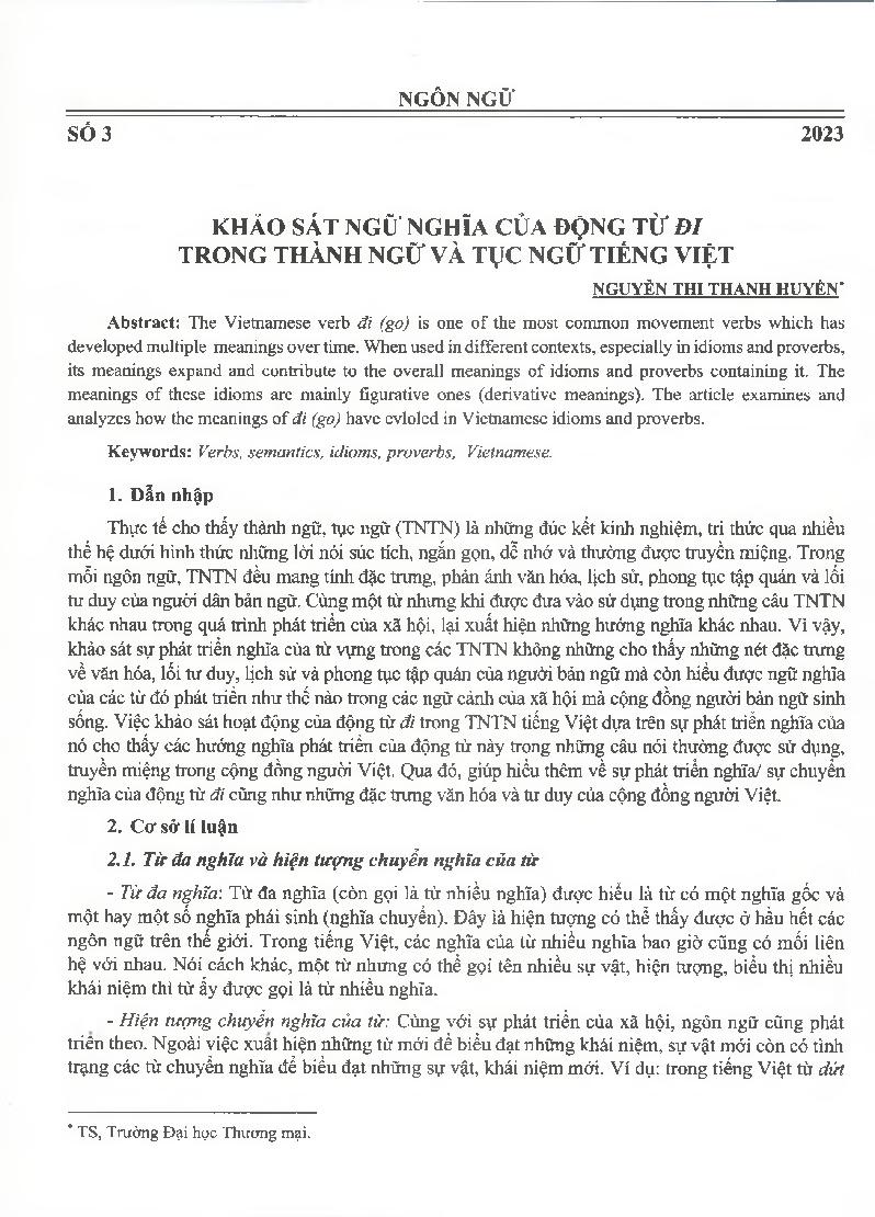 Khảo sát ngữ nghĩa của động từ đi trong thành ngữ và tục ngữ tiếng Việt = Semantic survey of the verb đi (go) in Vietnamese idioms and proverbs