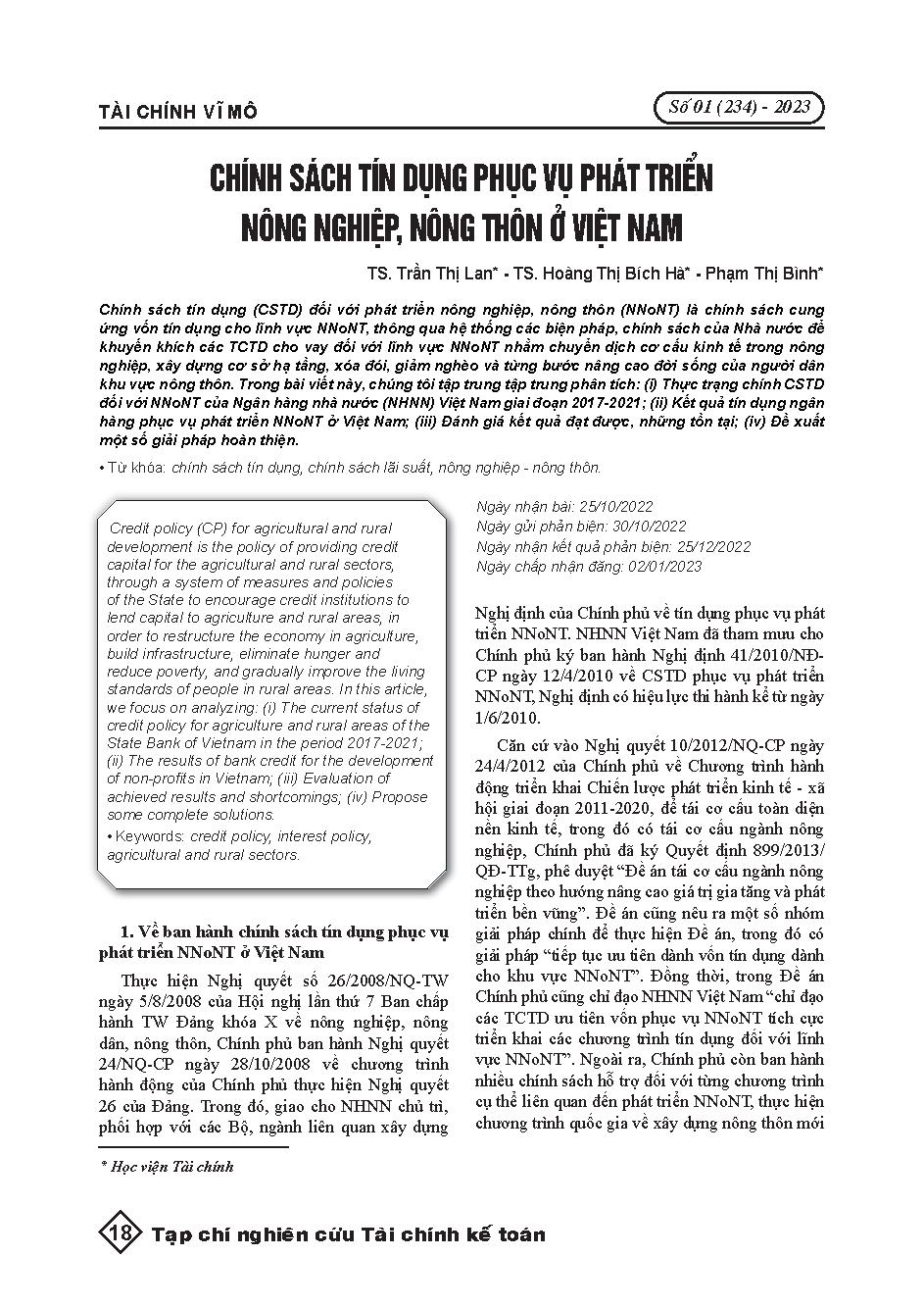 Chính sách tín dụng phục vụ phát triển nông nghiệp, nông thôn ở Việt Nam = Credit policy supporting agricultural and rural development in Vietnam