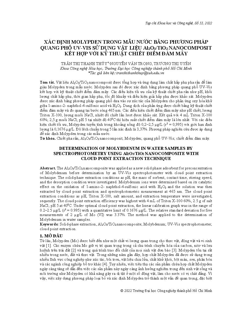 Xác định molypden trong mẫu nước bằng phương pháp quang phổ UV-VIS sử dụng vật liệu Al2O3/TiO2 nanocomposite kết hợp với kỹ thuật chiết điểm đám mây = Determination of molybdenum in water samples by spectrophotometry using al2o3/tio2 nanocomposite with cl