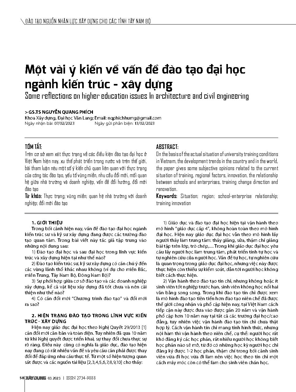 Một vài ý kiến về vấn đề đào tạo đại học ngành kiến trúc - xây dựng = Some reflections on higher education issues In architecture and civil engineering