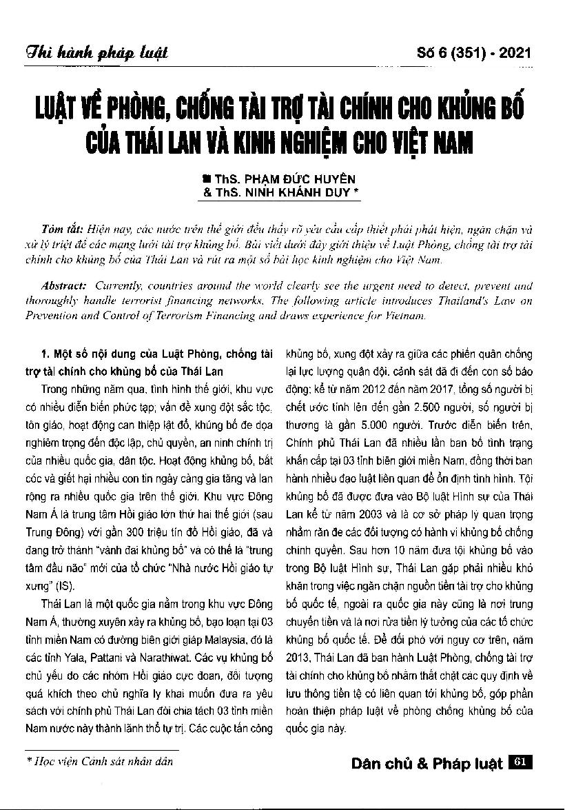 Luật về phòng, chống tài trợ tài chính cho khủng bố của Thái Lan và kinh nghiệm cho Việt Nam