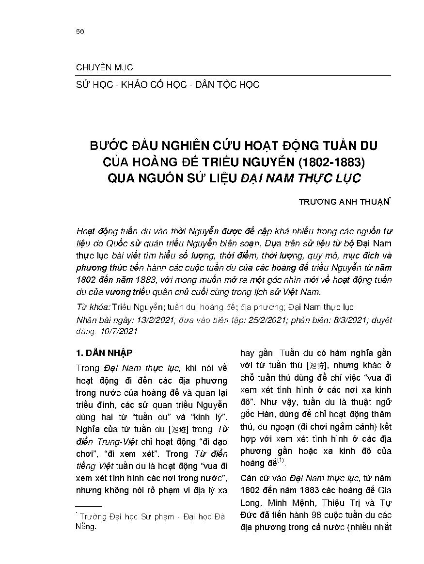 Bước đầu nghiên cứu hoạt động tuần du của hoàng đế triều Nguyễn (1802-1883) qua nguồn sử liệu Đại Nam thực lục = Preliminary research on the tours of inspection activities of the Nguyen dynasty emperors (1802-1883) through historical sources of Dai Nam thuc luc