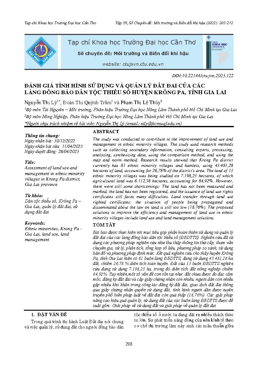Đánh giá tình hình sử dụng và quản lý đất đai của các làng đồng bào dân tộc thiểu số huyện Krông Pa, tỉnh Gia Lai = Assessment of land use and management in ethnic minority villages in Krong Pa district, Gia Lai province