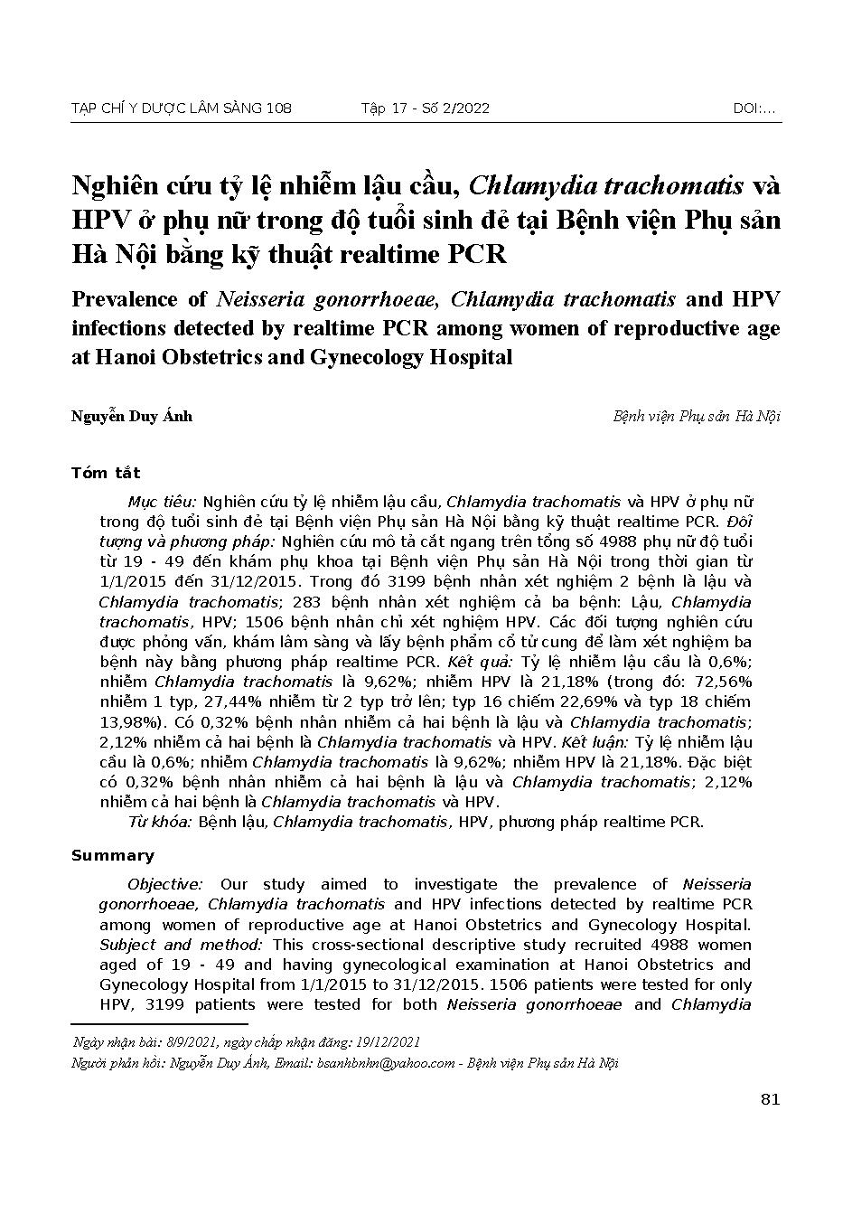 Nghiên cứu tỷ lệ nhiễm lậu cầu, Chlamydia trachomatis và HPV ở phụ nữ trong độ tuổi sinh đẻ tại Bệnh viện Phụ sản Hà Nội bằng kỹ thuật realtime PCR = Prevalence of Neisseria gonorrhoeae, Chlamydia trachomatis and HPV infections detected by realtime PCR am