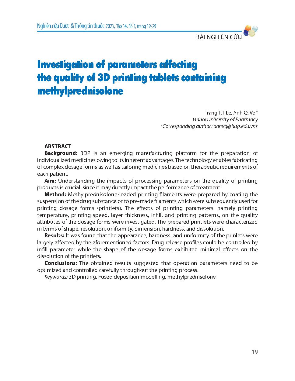 Khảo sát ảnh hưởng của một số thông số đến chất lượng của viên in 3D chứa methylprednisolon = Investigation of parameters affecting the quality of 3D printing tablets containing methylprednisolone