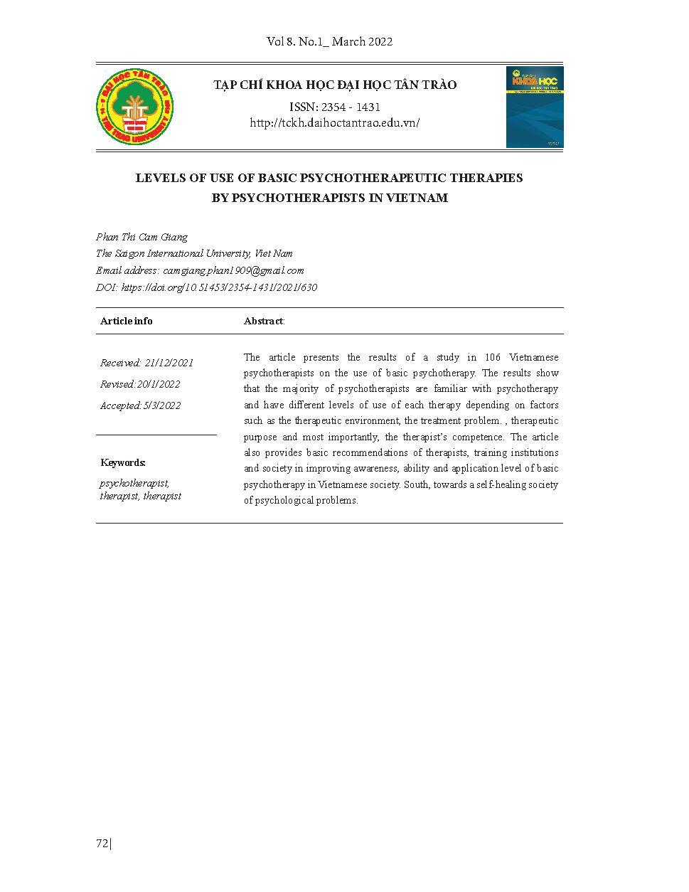 Mức độ sử dụng các liệu pháp tâm lý trị liệu cơ bản của các chuyên gia trị liệu tâm lý tại Việt Nam = Levels of use of basic psychotherapeutic therapies by psychotherapists in Vietnam
