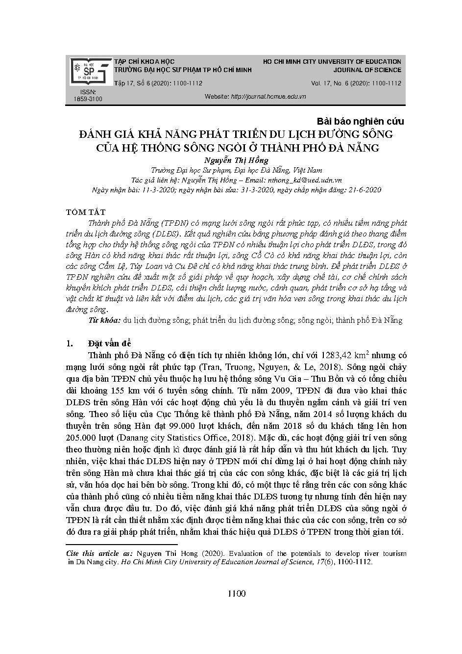 Đánh giá khả năng phát triển du lịch đường sông của hệ thống sông ngòi ở thành phố Đà Nẵng. = Evaluation of the potentials to develop river tourism in Da Nang city