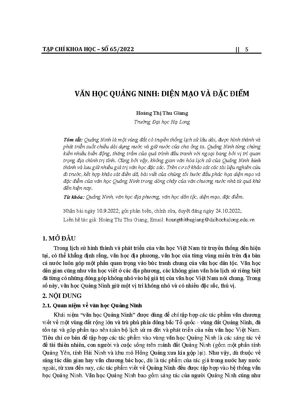Văn học Quảng Ninh: Diện mạo và đặc điểm = The face and characteristics of literature in Quang Ninh province