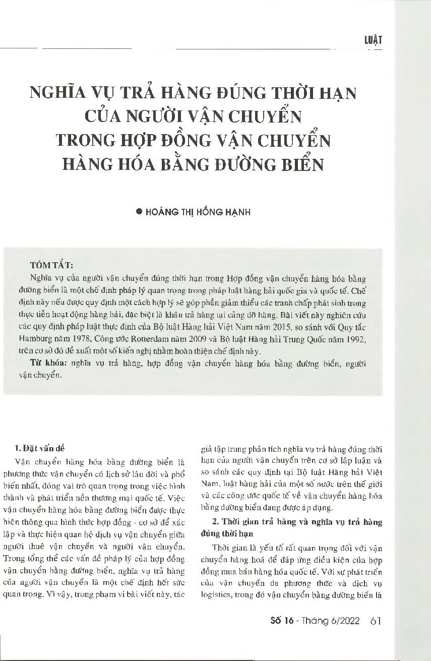 Nghĩa vụ trả hàng đúng thời hạn của người vận chuyển trong hợp đồng vận chuyển hàng hóa bằng đường biển = The obligation of carrier to deliver goods punctually in the contract of carriage of goods by sea