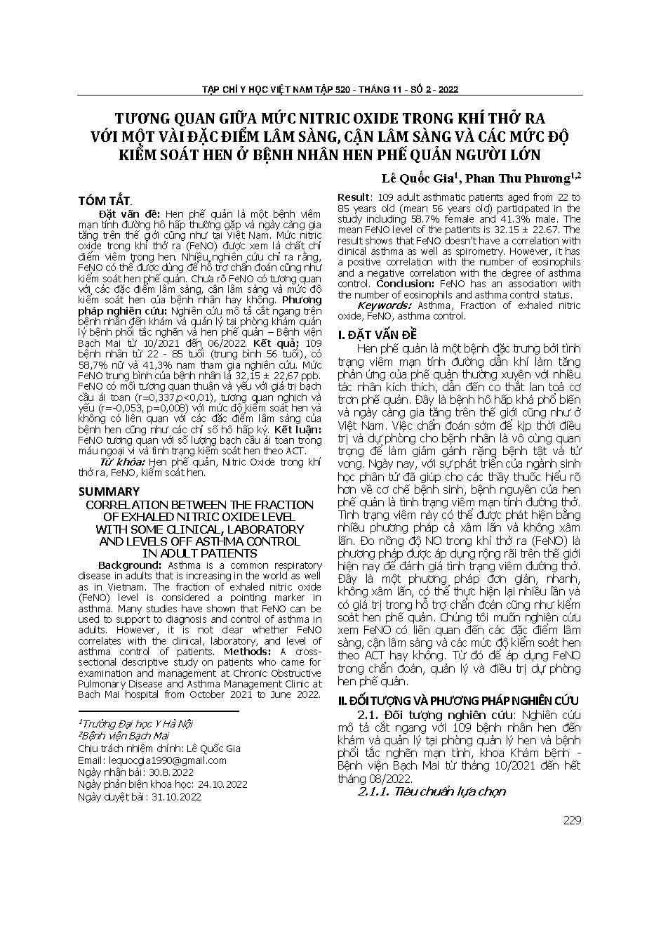 Tương quan giữa mức nitric oxide trong khí thở ra với một vài đặc điểm lâm sàng, cận lâm sàng và các mức độ kiểm soát hen ở bệnh nhân hen phế quản người lớn = Correlation between the fraction of exhaled nitric oxide level with some clinical, laboratory an