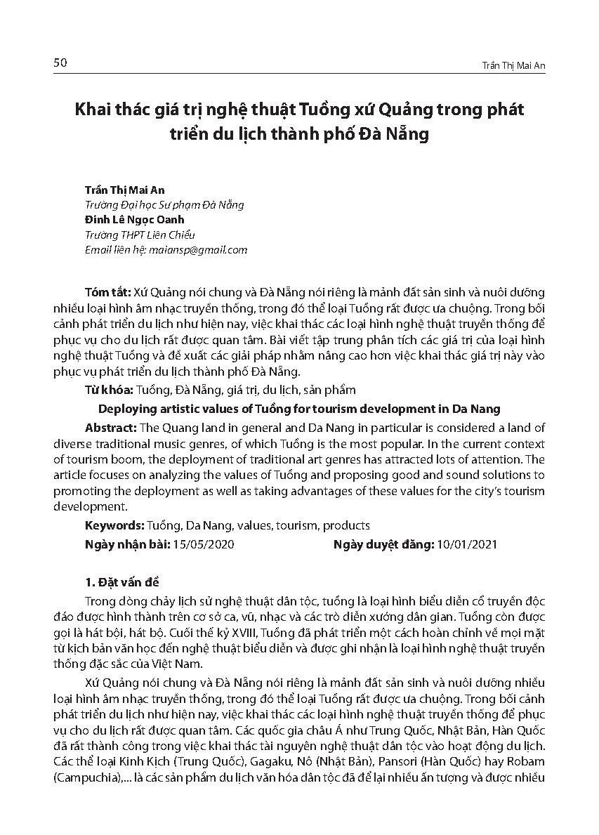 Khai thác giá trị nghệ thuật Tuồng xứ Quảng trong phát triển du lịch thành phố Đà Nẵng = Deploying artistic values of Tuồng for tourism development in Da Nang