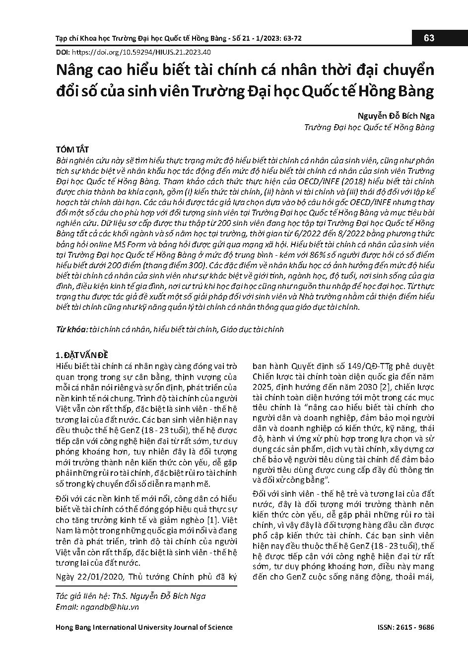 Nâng cao hiểu biết tài chính cá nhân thời đại chuyển đổi số của sinh viên Trường Đại học Quốc tế Hồng Bàng = Improve the personal financial literacy of Hong Bang International University students in the Digital transformation era