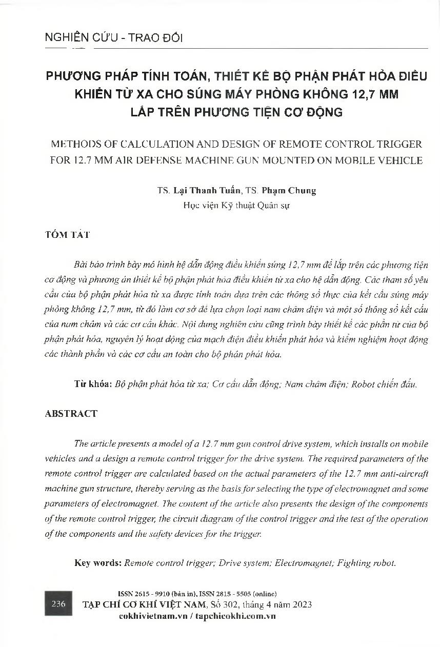 Phương pháp tính toán, thiết kế bộ phận phát hỏa điều khiển từ xa cho súng máy phòng không 12,7 mm lắp trên phương tiện cơ động = Methods of calculation and design of remote control trigger for 12.7 mm air defense machine gun mounted on mobile vehicle