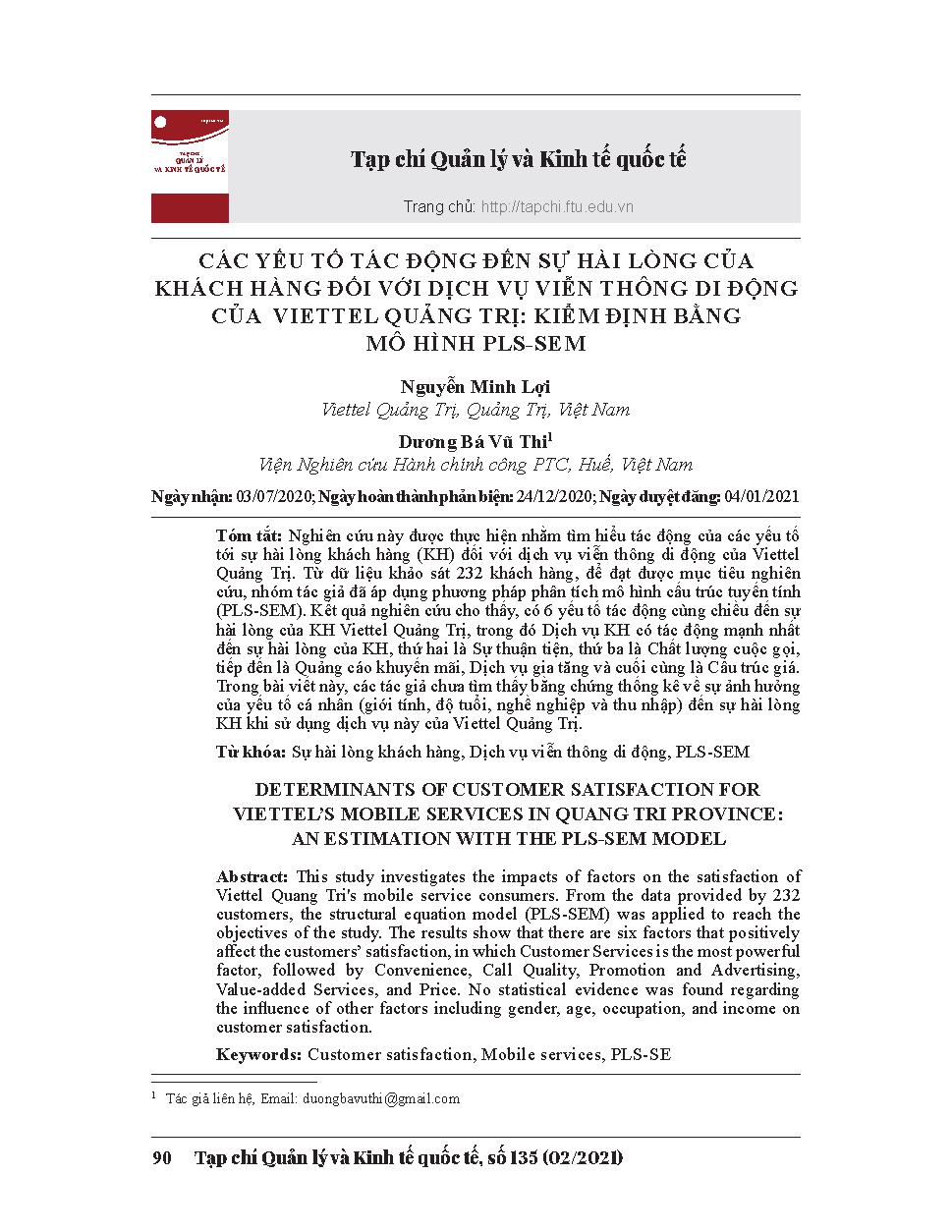 Các yếu tố tác động đến sự hài lòng của khách hàng đối với dịch vụ viễn thông di động của Viettel Quảng Trị: kiểm định bằng mô hình PLS - SEM = Determinants of customer satisfaction for Viettel’s mobile services in Quang Tri province: an estimation with the PLS – SEM model