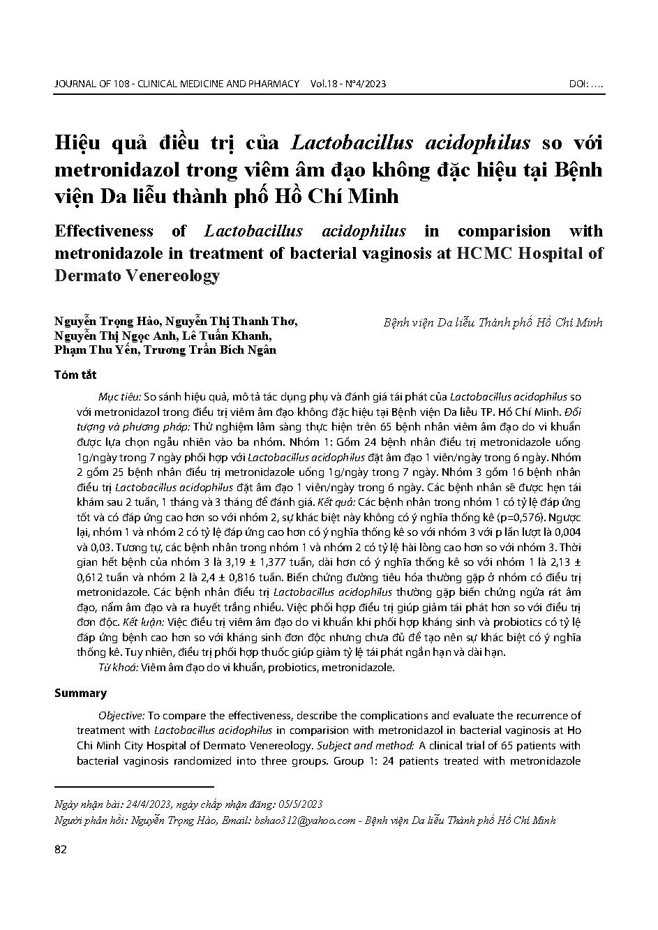 Hiệu quả điều trị của Lactobacillus acidophilus so với metronidazol trong viêm âm đạo không đặc hiệu tại Bệnh viện Da liễu thành phố Hồ Chí Minh = Effectiveness of Lactobacillus acidophilus in comparision with metronidazole in treatment of bacterial vagin