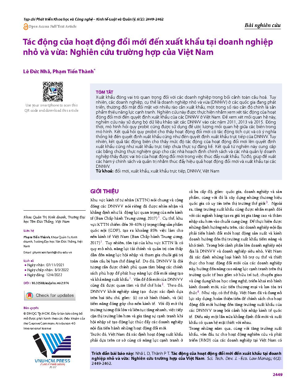 Tác động của hoạt động đổi mới đến xuất khẩu tại doanh nghiệp nhỏ và vừa: Nghiên cứu trường hợp của Việt Nam = The effects of innovation on export of the small and medium-sized enterprises: The case of Vietnam