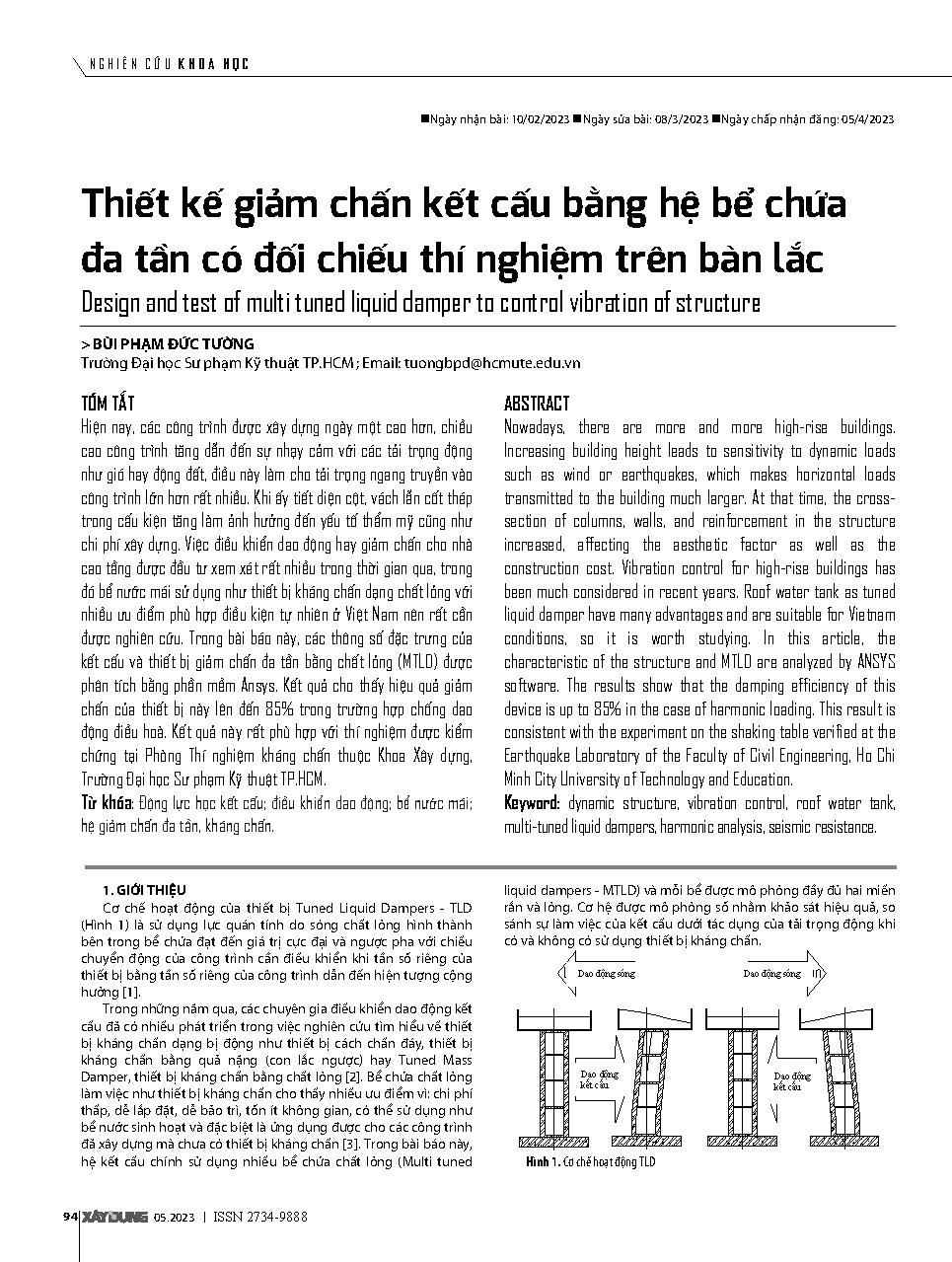 Thiết kế giảm chấn kết cấu bằng hệ bể chứa đa tần có đối chiếu thí nghiệm trên bàn lắc = Design and test of multi tuned liquid damper to control vibration of structure