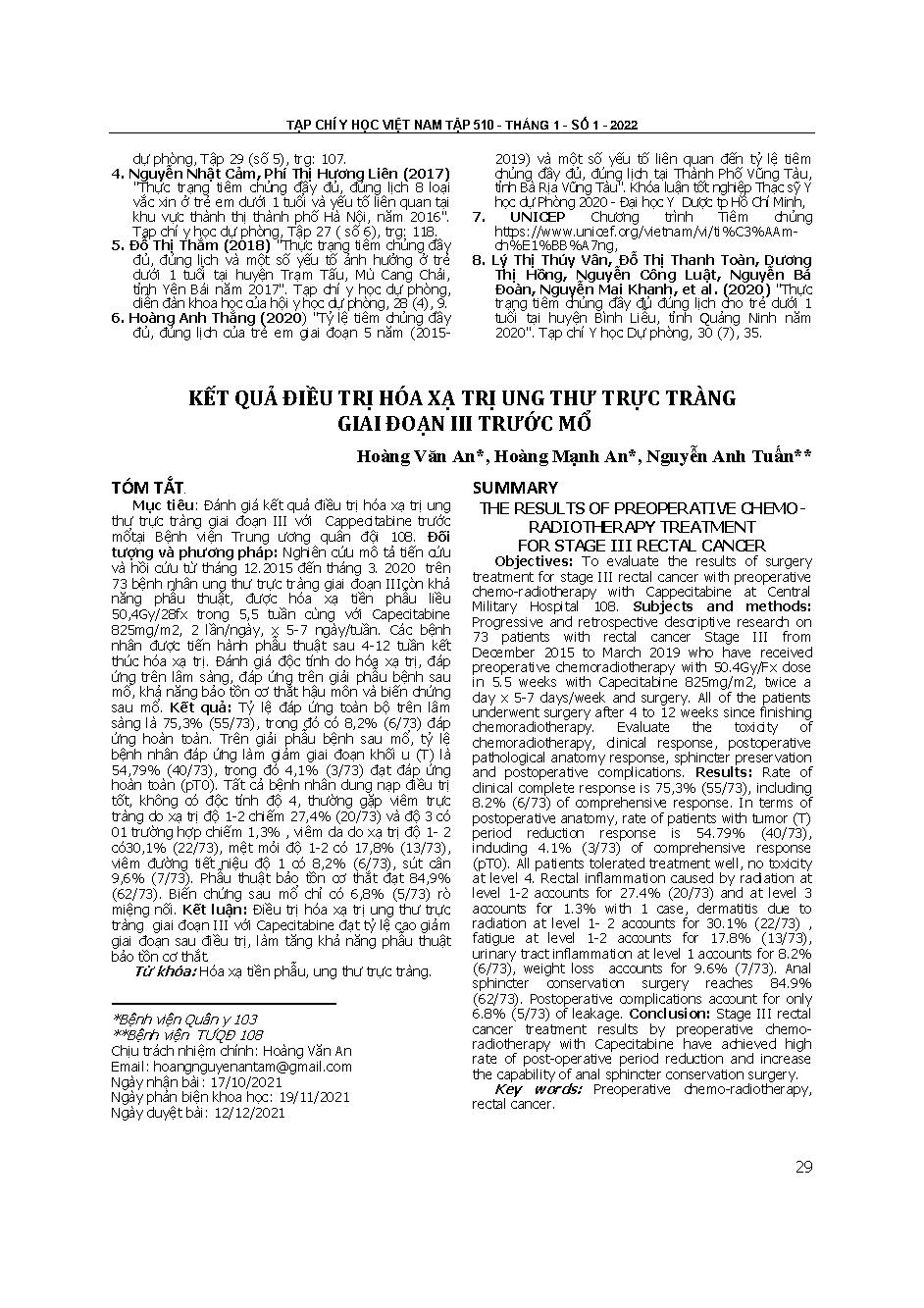 Kết quả điều trị hóa xạ trị ung thư trực tràng giai đoạn III trước mổ = The results of preoperative chemo-radiotherapy treatment for stage III rectal cancer