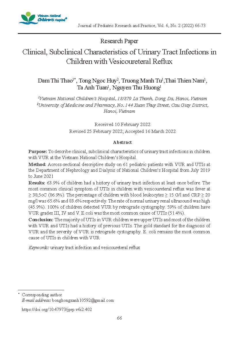 Đặc điểm lâm sàng, cận lâm sàng của trẻ trào ngược bàng quang niệu quan tiên phát có nhiễm khuẩn tiết niệu = Clinical, Subclinical Characteristics of Urinary Tract Infections in Children with Vesicoureteral Reflux