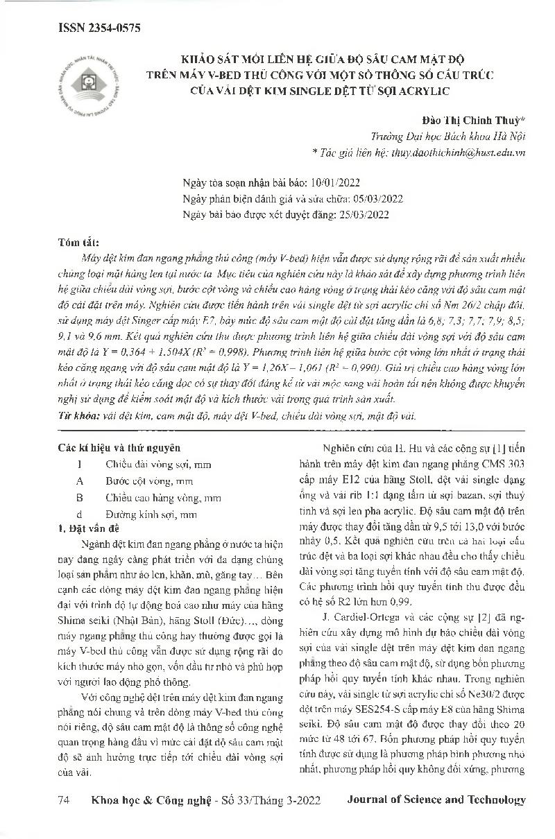 Khảo sát mối liên hệ giữa độ sâu cam mật độ trên máy v-bed thủ công với một số thông số cấu trúc của vải dệt kim single dệt từ sợi acrylic from Acrylic Yam = Investigate The Relationship between Stitch Cam Depth in Manual V-bed Flat Knitting Machine and S
