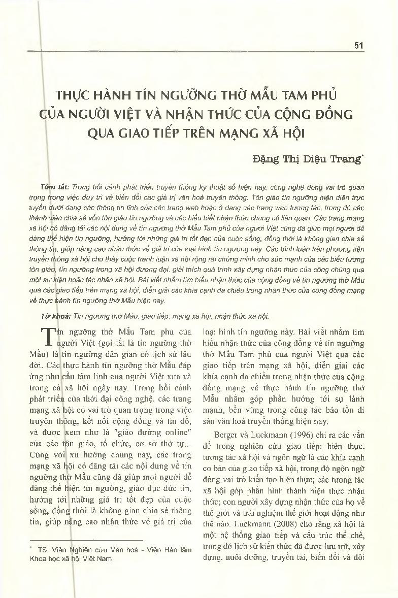 Thực hành tín ngưỡng thờ Mẫu Tam phủ của người Việt và nhận thức của cộng đồng qua giao tiếp trên mạng xã hội = The practice of Mother Goddess of Three Realm worship of Viet people and public awareness through communication on social networks