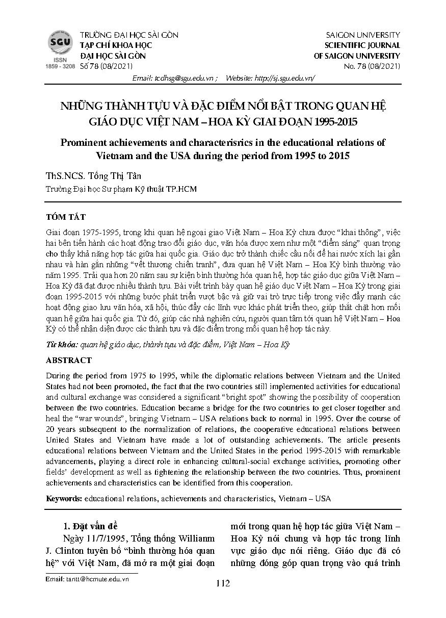 Những thành tựu và đặc điểm nổi bật trong quan hệ giáo dục Việt Nam – Hoa Kỳ giai đoạn 1995-2015 = Prominent achievements and characterisrics in the educational relations of Vietnam and the USA during the period from 1995 to 2015