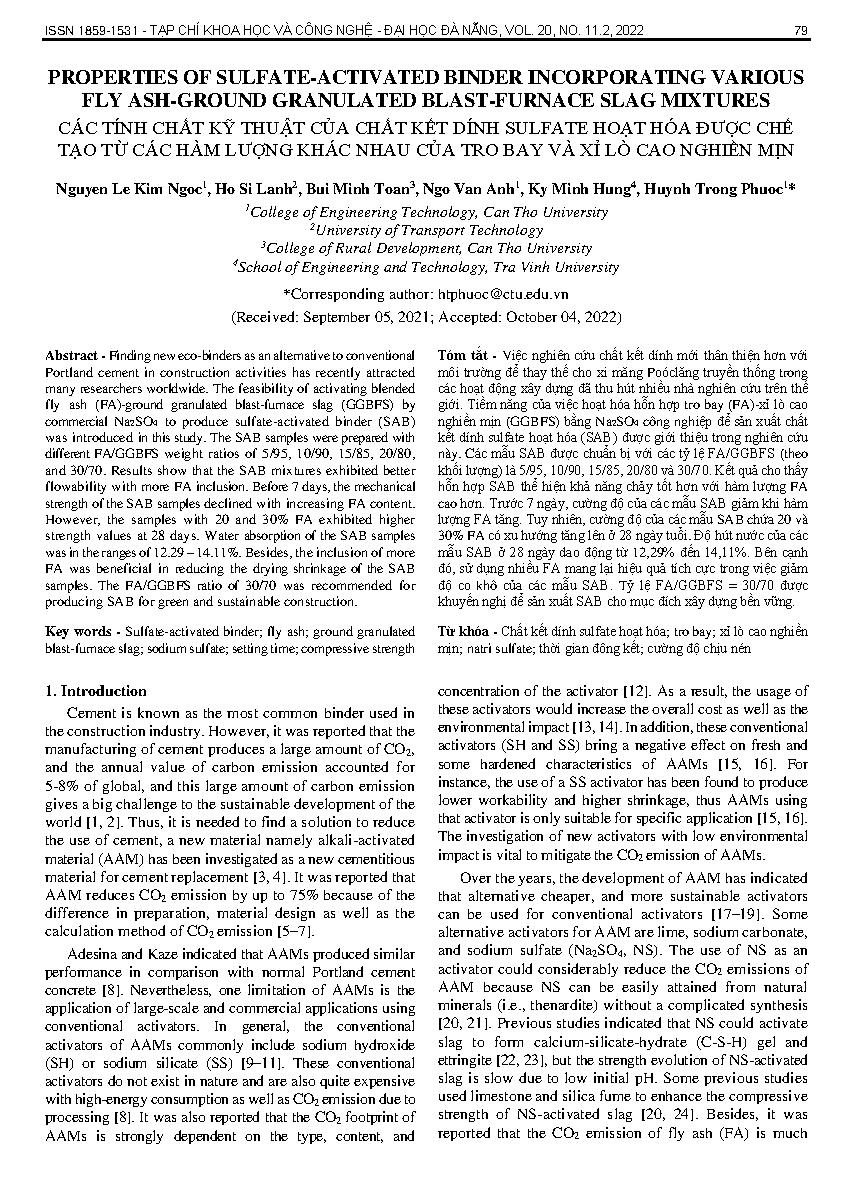 Các tính chất kỹ thuật của chất kết dính sulfate hoạt hóa được chế tạo từ các hàm lượng khác nhau của tro bay và xỉ lò cao nghiền mịn = Properties of sulfate-activated binder incorporating various fly ash-ground granulated blast-furnace slag mixtures
