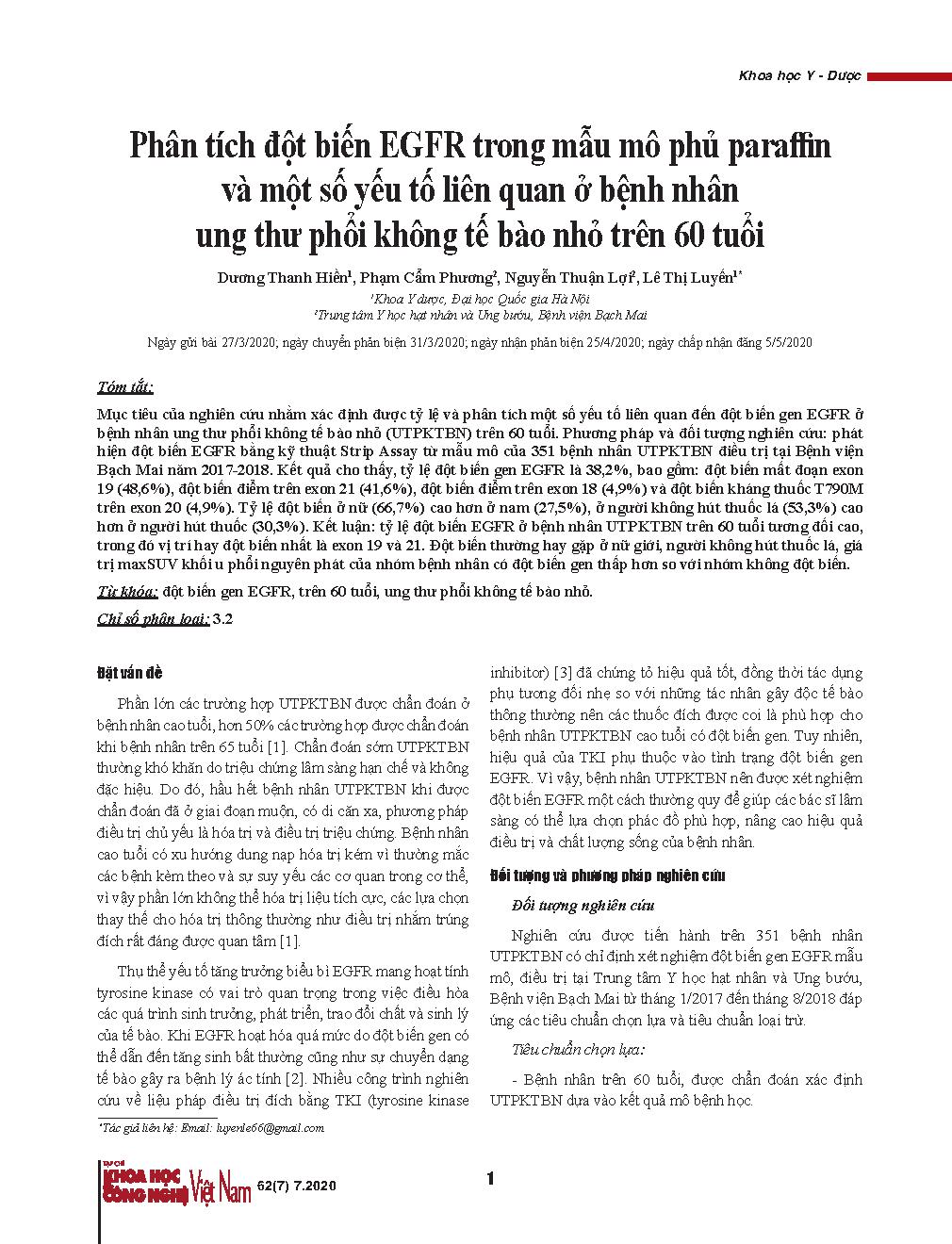 Phân tích đột biến EGFR trong mẫu mô phủ paraffin và một số yếu tố liên quan ở bệnh nhân ung thư phổi không tế bào nhỏ trên 60 tuổi. = Analysis of EGFR mutations in paraffin-covered tissue samples and some related factors from non-small cell lung cancer patients over 60 years old