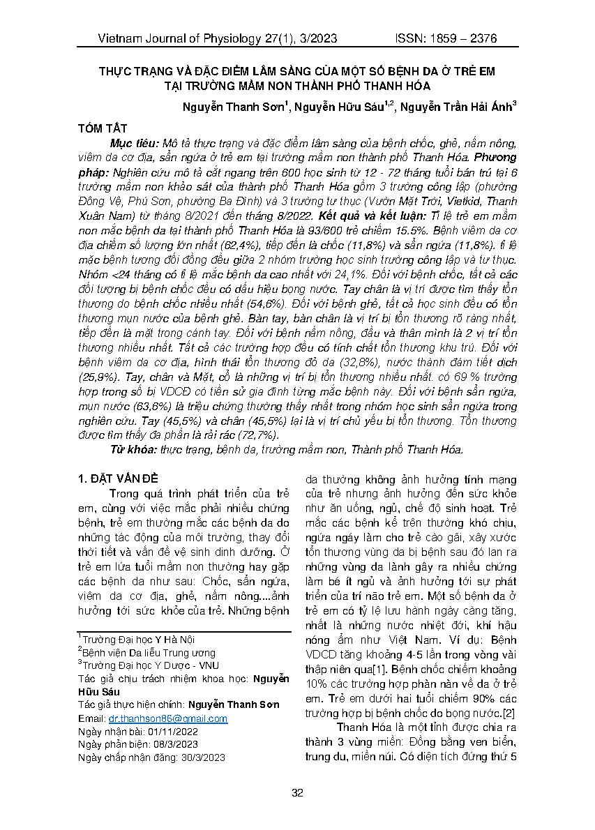 Thực trạng và đặc điểm lâm sàng của một số bệnh da ở trẻ em tại trường mầm non thành phố Thanh Hóa = Prevalence and clinical characteristics of some skin diseases in preschool children at Thanh Hoa city