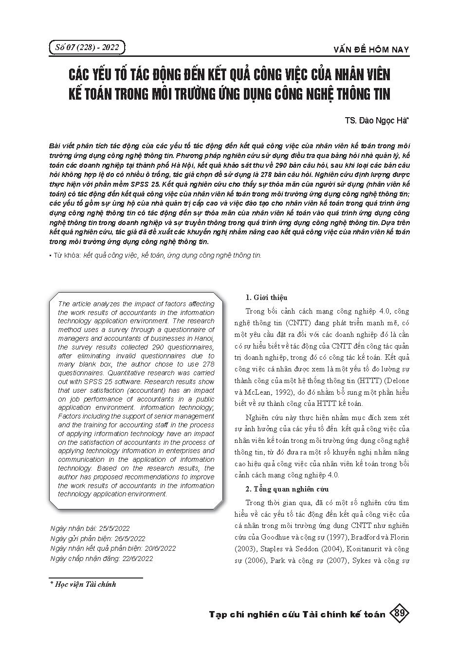 Các yếu tố tác động đến kết quả công việc của nhân viên kế toán trong môi trường ứng dụng công nghệ thông tin = Factors affecting accountants’ performance in the information technology working environment