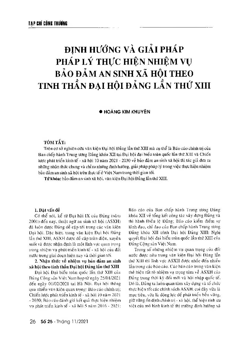 Định hướng và giải pháp pháp lý thực hiện nhiệm vụ bảo đảm an sinh xã hội theo tinh thần Đại hội Đảng lần thứ XIII = Orientations and solutions to the implementation of tasks of ensuring social security in Vietnam responding to the viewpoint of the 13th National Party Congress
