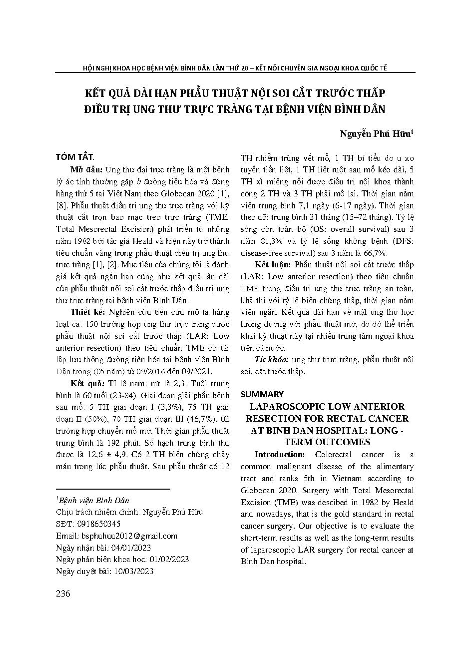Kết quả dài hạn phẫu thuật nội soi cắt trước thấp điều trị ung thư trực tràng tại Bệnh viện Bình Dân