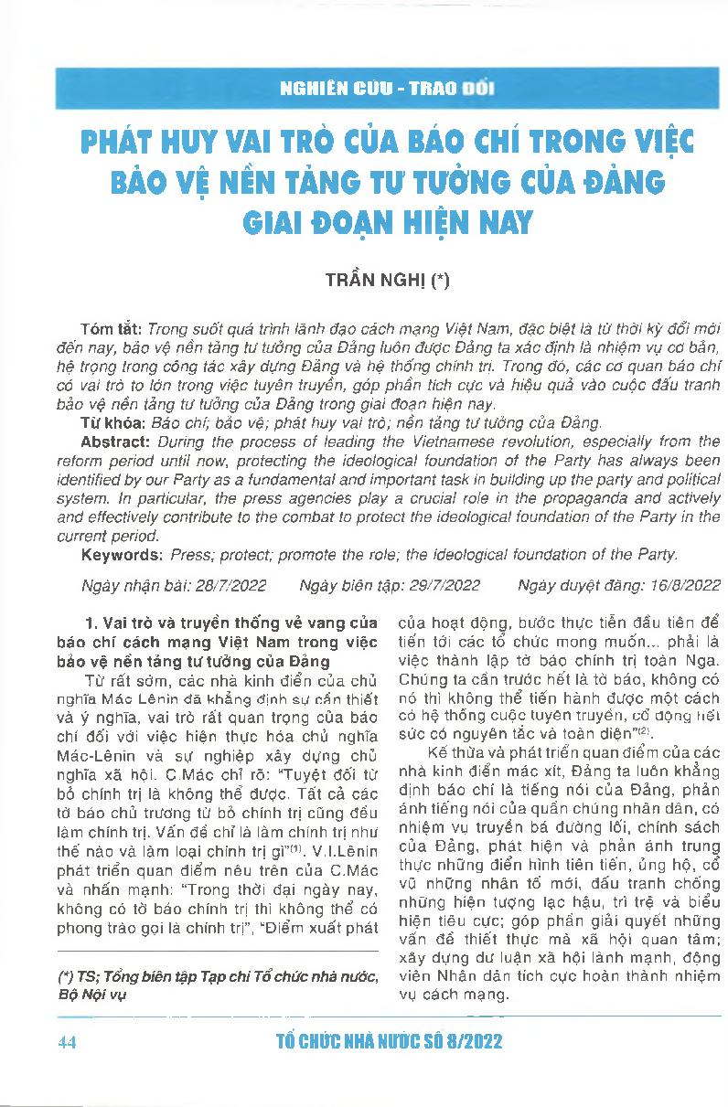 Phát huy vai trò của báo chí trong việc bảo vệ nền tảng tư tưởng của Đảng giai đoạn hiện nay = Promoting the role of the press in protecting the ideological foundation of the Party in the current period