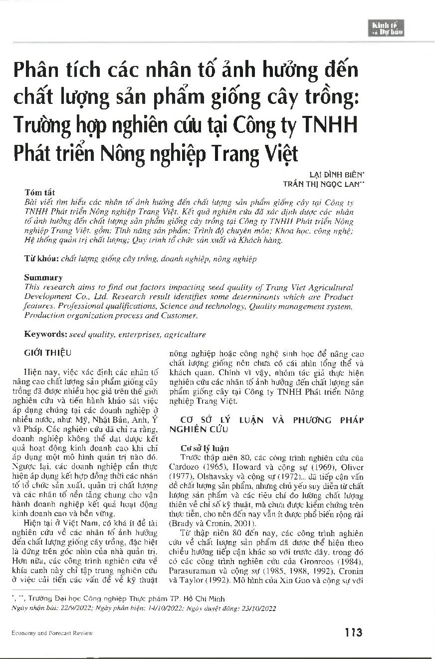 Phân tích các nhân tố ảnh hưởng đến chất lượng sản phẩm giống cây trồng: Trường hợp nghiên cứu tại Công ty TNHH Phát triển Nông nghiệp Trang Việt = Analysis of factors affecting seed quality of Trang Viet Agricultural Development Co., Ltd