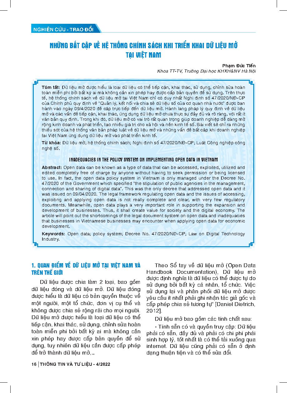 Những bất cập về hệ thống chính sách khi triển khai dữ liệu mở tại Việt Nam = Inadequacies in the policy system on implementing open data in Vietnam
