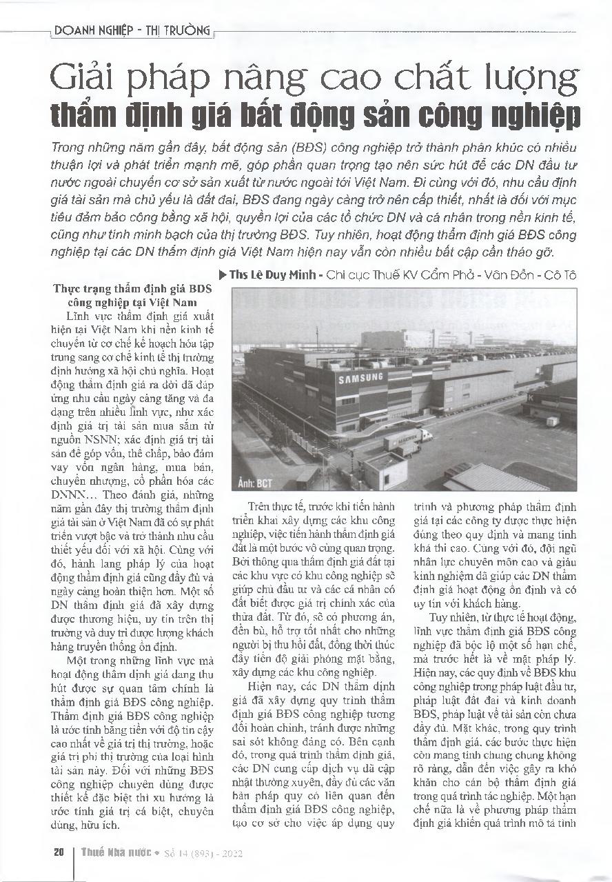 Giải pháp nâng cao chất lượng thẩm định giá bất động sản công nghiệp = Solutions to improve the quality of real estate appraisal